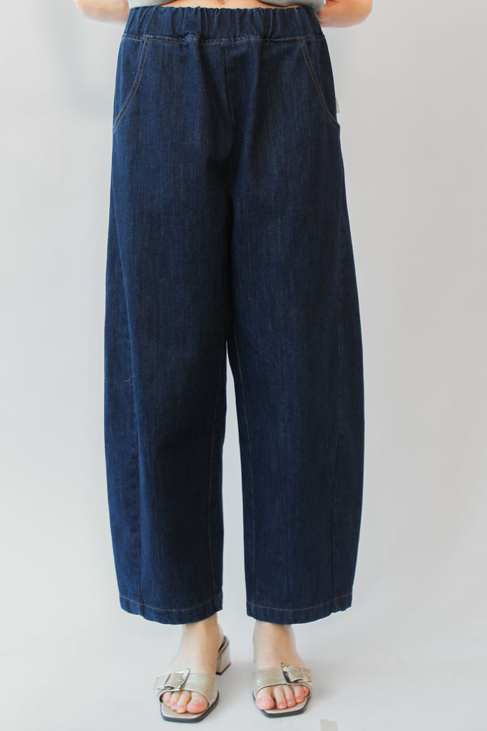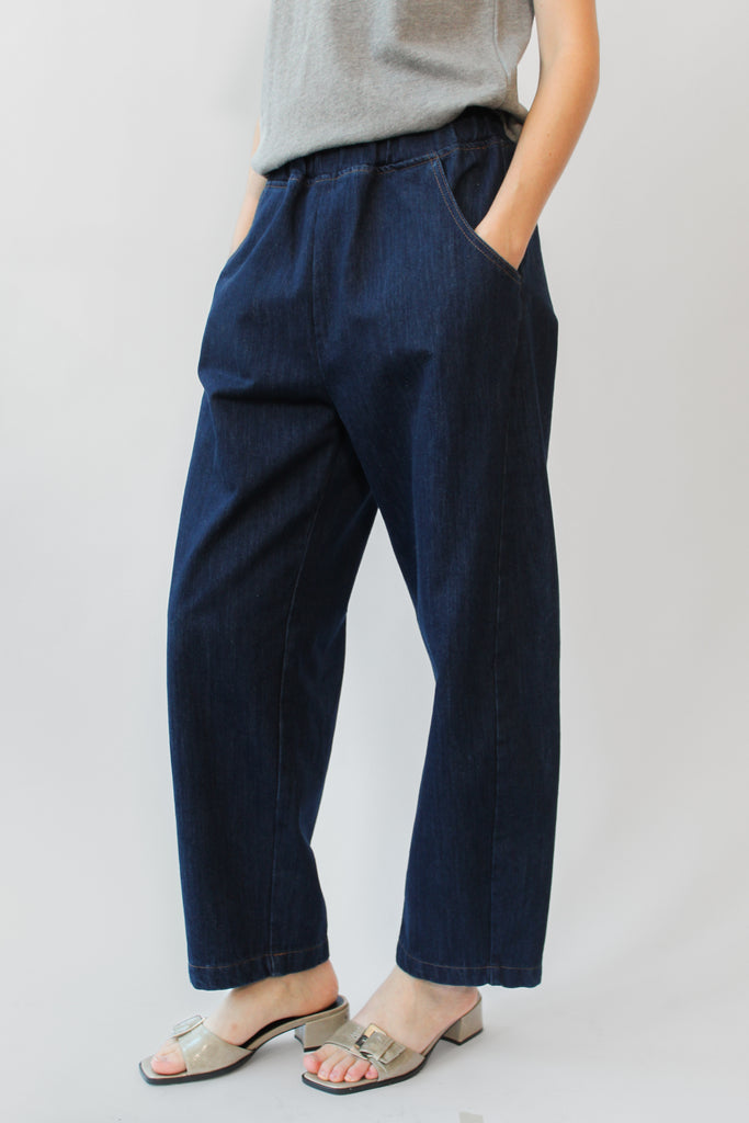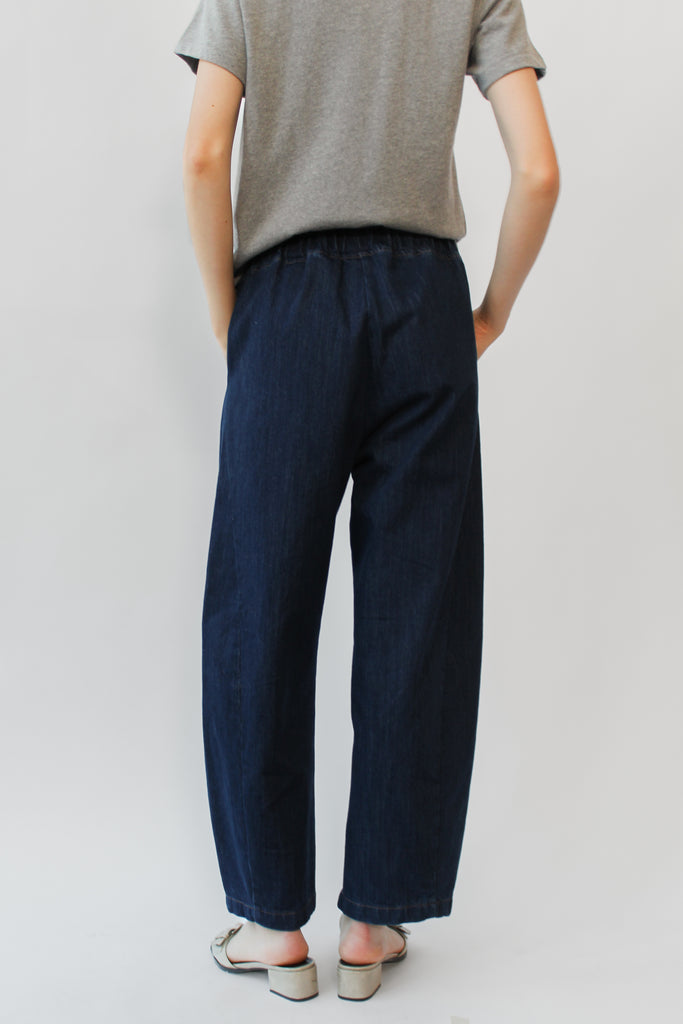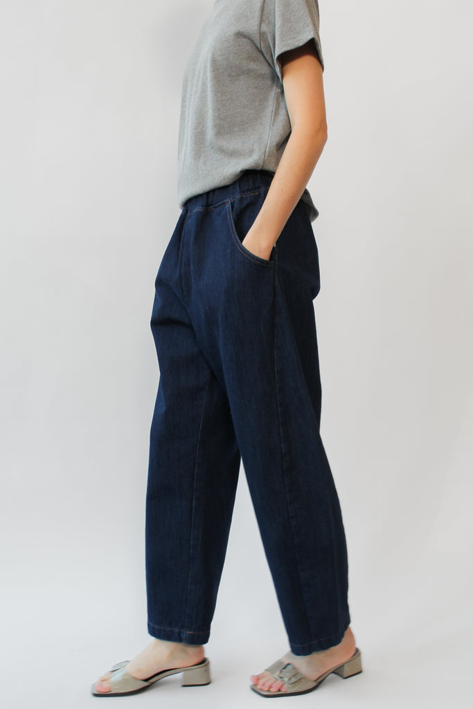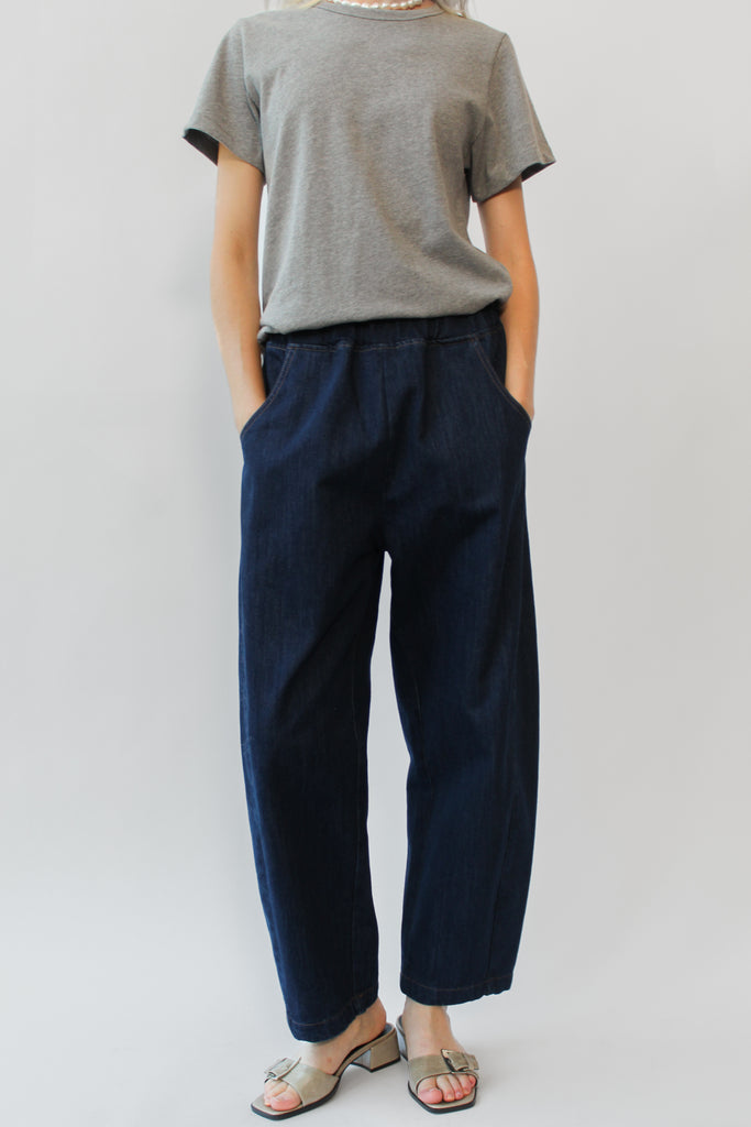 Le Bon Shoppe Arc Pants. These are the pants we love to live in! She has thoughtful design details like an elastic high waist that gives you a room to breath, slightly curved leg shape, cropped length to show off your favorite socks and shoes, unique side panels and deep pockets. The heavy-weight canvas material likely adds durability and gives them a structured look. The Arc pants would make a great addition to everyone's wardrobe and complement to all the Le Bon Shoppe pieces you own. Model is 5' 6", 110 lbs and wearing a size small