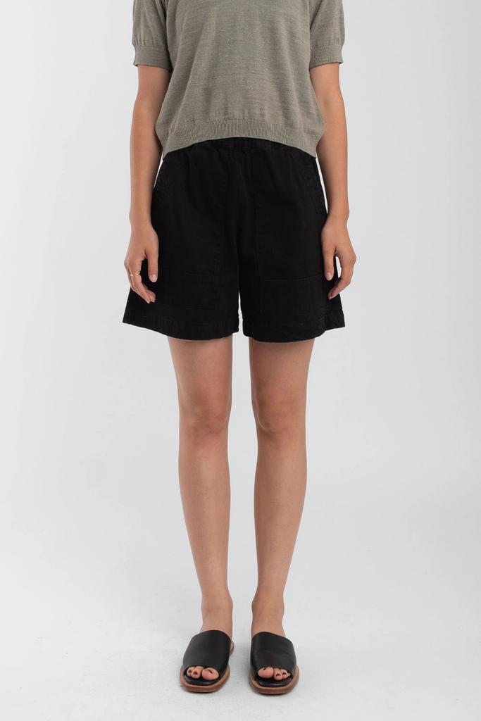 Micaela Greg Field Short is an easy, elastic waist short with large front patch pockets with seam detail. Short features one square back pocket and wide hem detail. Fits true to size, you may size up for a more oversized fit.