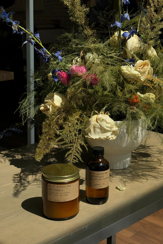 P.F. Candle Co. Arroyo Soy Candle. A love letter to the quiet wild of the Arroyo Seco. A passageway of twisted terrain perfumed by native sagebrush, crushed oak leaves, shady creek beds, and canyon stone.