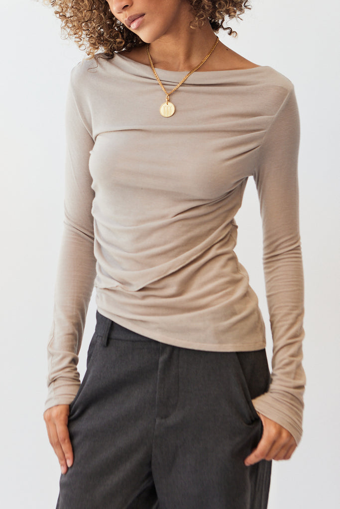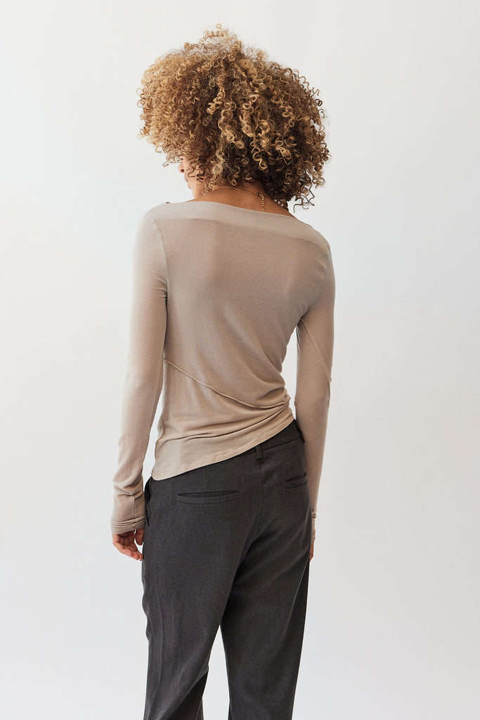 Gee Drew top, a draped neck long sleeve knit top. Made from a super stretchy semi sheer tencel. Features an asymmetric hem. Sophia is 5'8" and wearing size small.